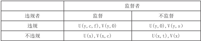 该式中:u 为效用函数 ;p 表示行为被定性违规的概率;y 代表违规者从违规行为中获得收益的货币等价物;c 为违规行为需要支付的相应成本,f 视为违规者所受的货币等价物等惩罚。由此列示出违规者与监管者各自的预期效用,并据此构建一个双方博弈关系,见表 1[2] 。