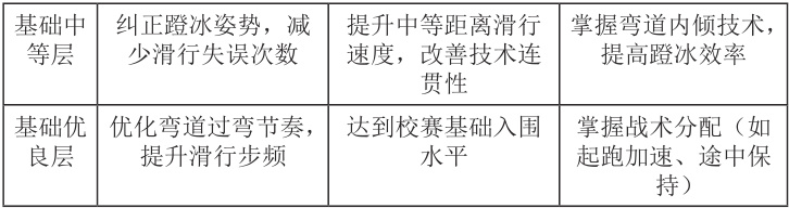 (1)内容:蹬冰发力纠正(避免踮脚、强调大腿发力)、弯道技术(内倾角度控制、重心转移)、中等距离间歇滑行练习;
