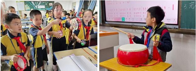 打击乐器进课堂一方面能够有效丰富教学内容,另一方面也能够令学生的多元音乐参与需求得到有效满足,确保音乐课堂的整体质量得到有效提升, 多机会展现自己 首先,可以组织小型打击乐合奏、开展班级音乐演出,给学生搭建展示的 的时候,能巩固已经学过的知识,还能提高音乐表现水平。并且可以引导学生编排简单的打击乐节目, 引导学生自己设计节奏模式和演奏形式。在音乐课上开展打击乐器教学活动,能激发学生对打击乐器的兴趣,培养学生的音乐审美能力,同时对于学生的注意力、表现力等多种能力的提升都有积极意义 [3]。(图5 和图6)