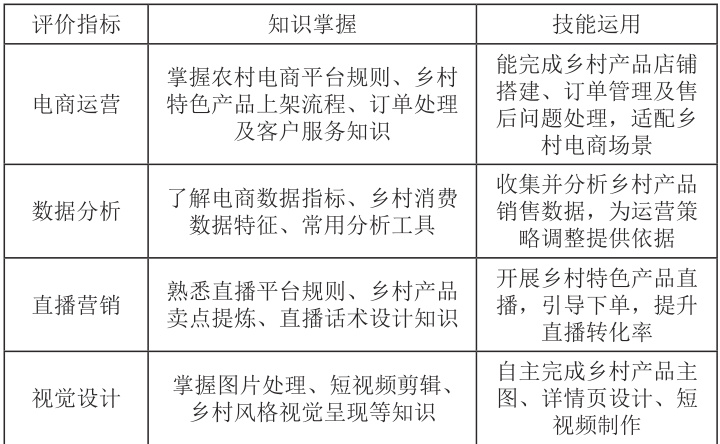 专业知识技能是核心素养最基本的体现,是学生必须掌握的能力。在数字经济与乡村振兴战略深度融合的新时代背景下,农村中职电商专业学生应突破传统技能边界,紧跟时代发展,形成“数字技术 + 产业场景+ 乡村特色”的三维能力架构。笔者将专业知识技能维度划分为电商运营、数据分析、直播营销、视觉设计等核心指标(如表1)。