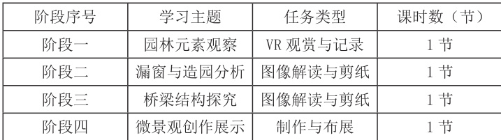 园林与桥梁主题项目式教学采用分阶段推进的结构安排,借任务层层递进促成学生认知与能力同步提升,每一阶段任务沿“观察—分析—建构—表达”路径展开,在内容深度与技能复杂度上逐级拓展。初始阶段聚焦山石植物、窗格图案等基础构成元素,结合图像观察与 VR 模拟实现认知启蒙,中段经过图纸解析、模型构建强化结构意识,引导塑造含比例与秩序感的艺术形象,后期进入创意表达阶段,完成微景制作、综合装饰及展陈设计,形成完整项目输出。任务安排紧密对接课程标准,贯穿学生表现性任务与艺术实践活动,搭建从单一技能训练到综合创造表达的螺旋式学习路径,体现任务驱动下的系统化教学逻辑,见表 1 :任务实施节奏与活动安排需有分层聚焦特征,助力形成有效螺旋式认知推进。
