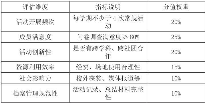 学校需从育人全局出发,将社团纳入整体发展规划。首先,制定系统性《学生社团管理办法》,明确社团注册、运作、评估与退出机制,推动“一社一章程”落地,增强制度约束力与可操作性。其次,借鉴潮汕“星级社团”评比机制,建立涵盖活动频率、成员满意度、创新性、资源使用效率、社会影响力的多维度量化评估体系,整合教师、成员及管理部门反馈,将考评结果与社团经费分配、评优激励挂钩。最后,推动社团活动课程化,为学术与科技类社团设固定课时并纳入课程体系,从制度上保障其时间与场地需求。