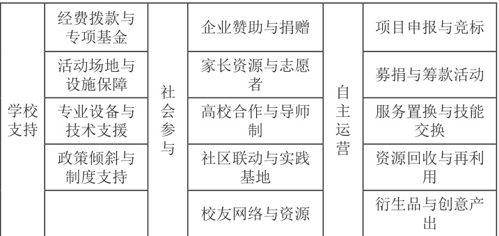 在资源利用方面,学校应努力构建“学校支持、社会参与、自主运营”相结合的多元资源保障模式(表 2)。学校可以设立社团发展专项基金,优化经费审批与使用流程,同时鼓励社团通过项目申报、对外募捐与合作赞助等方式拓展资金来源。在校内整合现有场地设施,建立共享预约制度,提升专业教室、实验室、体育场馆等资源的利用效率。此外,应积极推进社团管理信息化建设,构建集招新、活动发布、过程记录与反馈评价于一体的数字平台,全面提升管理透明度与运作效能。