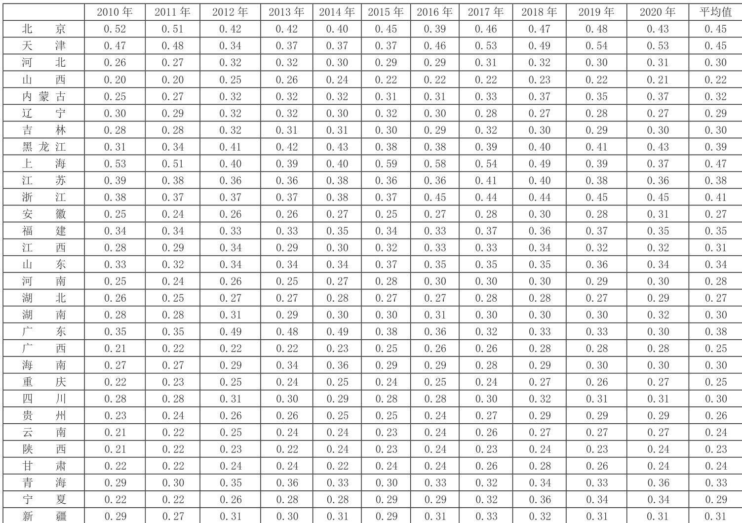 本文采用熵权法确定各个基础指标的权重结构合成综合指标,对中国各省份 2010~2020 年的农业高质量发展水平进行评价。为了测度中国各省农业高质量发展水平,依据前文的指标评价体系和评价方法对2010~2020 年各省份的基础数据进行农业高质量发展水平测算,测算结果见表 1。表 1 给出了 2010~2020 年各省农业高质量发展平均水平的空间分布。从数值来看,2010~2020 年间农业高质量发展水平较高的地区主要集中于京津和东部沿海地区,中部和西南地区农业高质量发展水平较低,其他地区农业高质量发展水平居中,这表明省际农业高质量发展水平区域差距十分显著,呈现阶梯状的分布态势;随着时间的推移,中西部地区会逐渐崛起,对东部沿海地区呈追赶态势,地区农业发展差距会不断缩小。具体来看,考察期内农业高质量发展水平的平均得分高于 0.41 的地区包含北京(0.45)、天津(0.47)和上海(0.47)三个地区,北京、天津和上海构成中国农业高质量发展的“第一梯队”;其次,广东、浙江、江苏和黑龙江四个省份的农业高质量发展水平平均值高于 0.35,组成其“第二梯队”,此外剩余 23 个省份农业高质量发展水平平均值低于 0.38,占全部考察省份的 76.67% ;四川、湖南、海南、河北、吉林、新疆、江西、内蒙古、青海、山东和福建十一个省份的农业高质量发展水平平均值高于0.29,组成其“第三梯队”;剩余的十二个省份构成其“第四梯队”,这些省份大部分位于中西部地区。
