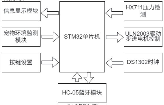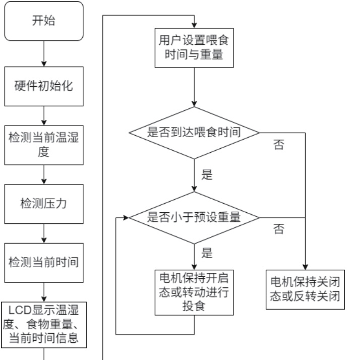 鉴于此,本文提出了一种以 STM32F103C8T6 为主控芯片,整合液晶显示、数字温湿度采集、按键设置、压力检测、电机控制和时钟定时功能的宠物喂食系统,以较低成本解决宠物无人照看时的喂食问题。