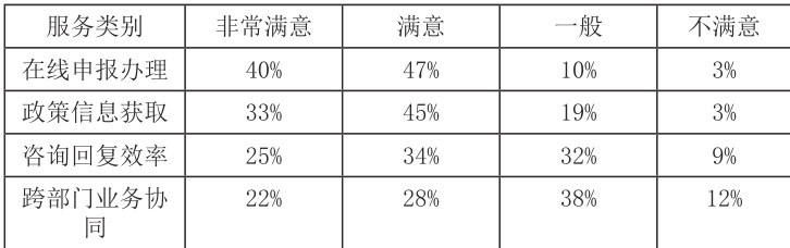 调查数据显示,制造业中小企业对一网通办服务总体上持肯定态度。在线申报办理环节满意度(非常满意 + 满意)高达 87%,反映出线上流程较为顺畅,获得普遍认可。政策信息获取方面,也达到了 78% 的较高满意度,但仍有一定比例企业认为信息更新和精准推送有待提升。值得注意的是,企业对咨询回复效率与跨部门业务协同的满意度相对较低,分别为59% 和 50‰ 。说明在实际操作过程中,复杂咨询响应和跨部门信息流转仍是提升营商便利度的瓶颈环节 [2]。