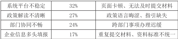 虽然一网通办提升了营商便利度,但在实施过程中仍出现一些亟需解决的问题。从表中可以看到,系统平台不稳定是最突出的问题,占比 32%,常见表现为页面卡顿、材料上传失败等,直接影响企业办理体验。政策解读不清晰问题占比 27% ,表现在政策指引不明确、语言晦涩难懂。部门协同不畅和企业信息多头填报分别为 24% 和 17%,导致跨部门事项办理效率低下及企业重复劳作。这些问题说明,一网通办“最后一公里”改革仍需发力,加强技术支撑、标准统一和服务指引,才能进一步释放中小企业活力。
