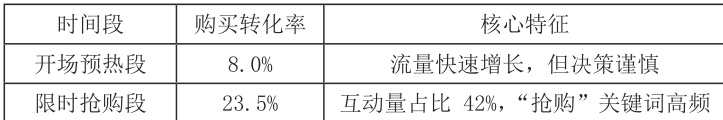 ①分时梯度促销:预热期:推出“限量预约”(如前100 名赠品),锁定目标用户并测试需求;抢购期:采用“多批次放货”(如每15 分钟释放20% 库存),维持稀缺真实性;结束期:针对未成交用户推送“后悔药折扣”(如24 小时内独家返场)。