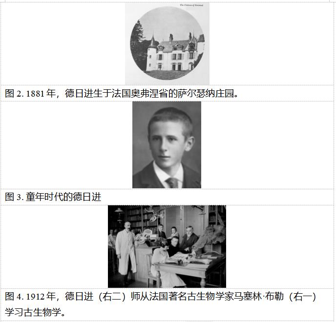 1881年,德日进出生于法国奥弗涅省的萨尔瑟纳庄园。受父母的影响,德日进自幼就对科学有浓厚的兴趣,对古老的东方—中国也有着深切的向往。 在《马可·波罗游记》的陪伴下,他初识中国;在大学期间,他涉足古生物学领域,并将中国的远古生命作为他的研究课题之一。1912年,德日进师从法国著名古生物学家马塞林·布勒学习古生物学。1922年,德日进根据桑志华提供的化石标本在《巴黎科学院述评》上发表论文《在中国西部蓬蒂期出土的动物群》,开启了他与东方远古生命的首次科学联系。