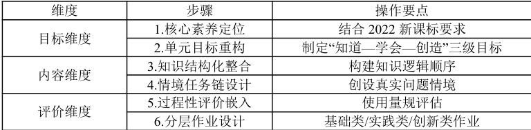 单元整体教学是以学科核心素养为统领,打破传统单课时教学,对教材单元内容进行有机整合,形成一种结构化、递进式教学的整体教学方式。其特征主要有:(1)整体性。以单元主题为统摄,综合教学目标、内容、评价,摒弃知识的碎片化教学。(2)情境性。通过建构真实或模拟的任务情境,让学生在解决真实问题中建构知识。(3)递进性。通过设计具有逻辑关联的学习任务链,使认知实现从浅层到深层的递进式上升。