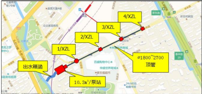 顶管施工适于修建穿过已成建筑物、地下管线复杂区域,是一种非开挖的管道埋设施工技术。尤其在已建成区,由于前期规划不能满足现状排水需要,但开挖排管受限于交通、建筑物障碍等问题,勘探的地下管线复杂,因此采用对周边影响破坏较小、施工精度较好的顶管法进行排管施工,广泛适用于城市管道工程,有效减小对施工点周边的生活影响,保障区域安全稳定。