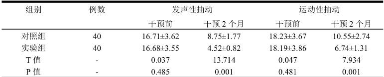干预前,两组患儿的抽动症状对比无显著差异, P>0.05 。干预后,实验组患儿的发声性抽动、运动性抽动评分均低于对照组,两组患儿的抽动症状对比差异显著, P<0.05 。见表1。