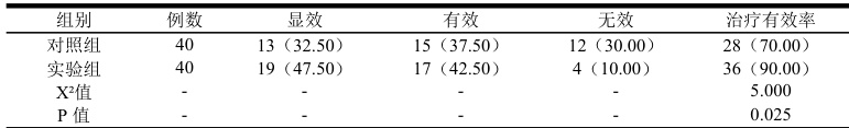 经医治后,实验组患儿的显效与有效病例数量均多于对照组,其治疗有效率 (90.00%) )高于对照组 (70.00%) 。两组患儿的治疗有效率对比差异显著,