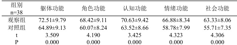 应用欧洲癌症研究和治疗生活质量核心量表 QLQ-C30,对两组患者护理后的生活质量进行评价。症状自评量表由身体、角色、认知、情感和社会功能 5 个维度,得分越高,生活质量越好[3]。