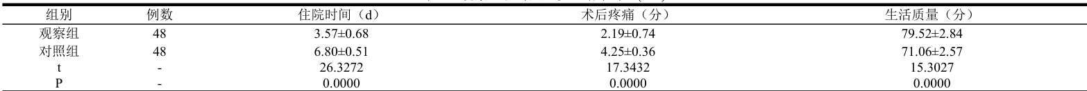 ),术后疼痛评分低于对照组(P<0.05 ),生活质量高于对照组( (P<0.05) )。详情见表1。