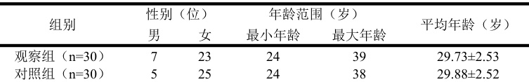 将我院于 2024 年3 月至 2026 年 3 月的 60 位临床护理专业护士,随机分为观察组、对照组,各30 位。两组护士临床资料如表1 所示: