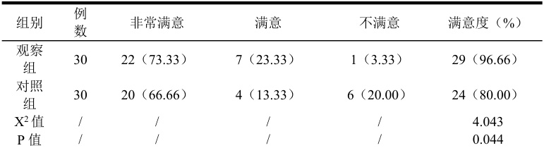 在护士对护理教学的满意度方面,观察组为 96.66% (29/30),对照组为 80.00% (24/30),观察组明显高于对照组,有统计学意义, P<0.05 ;见表 2.