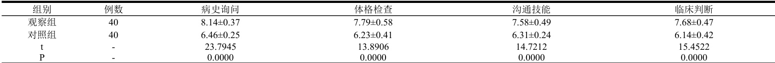 将观察组和对照组教学结束后的病史询问、体格检查、沟通技能、临床判断各项能力进行记录,以此了解 MDT 结合以问题为基础的整合教学模式提升全院护理实习生临床思维及岗位胜任能力的应用效果。