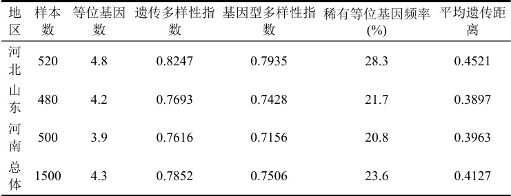 表1 数据揭示病原菌群体遗传多样性呈现明显的地理分布特征,河北地区菌株表现出最高的遗传多样性指数以及稀有等位基因频率,反映该地区病原菌群体遗传结构最为复杂,适应性进化潜力最强。地区间遗传多样性差异为区域化防治策略提供科学依据,高遗传多样性地区需要采用更加多元化的防治措施组合,以应对病原菌快速变异带来的挑战,同时遗传距离数据表明群体内分化程度适中,为抗病品种合理配置以及防治技术优化奠定理论基础。