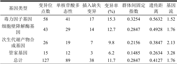 在遗传多样性分析基础上,进一步聚焦致病相关基因的变异特征,通过序列比对分析揭示关键功能基因的变异模式,结合群体分化参数评估不同地理群体间的遗传差异程度,为精准防治策略制定提供分子水平的科学依据。