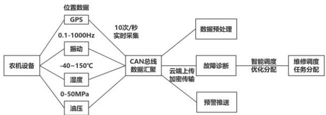 设备监控与数据采集系统借助部署多类型传感器达成农机设备运行状态全方位监测。GPS 定位系统精度能控制在 1 米范围以内,振动传感器监测频率覆盖 0.1Hz 至1000Hz 这个区间,温度传感器监测范围是从-40℃到 150℃且精度为 ±0.5∘C ,数据采集频率设定成每秒10 次,多源传感器数据经由 CAN 总线汇聚到边缘计算网关,经过预处理之后上传至云端服务器。系统构建了设备状态阈值模型,在监测参数超出正常范围时自动触发预警机制,数据传输运用加密协议确保信息安全,同时支持断网续传功能保障数据完整性。