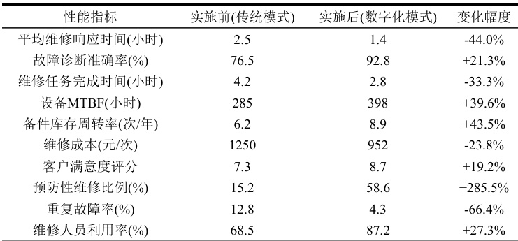 通过对比分析数字化管理实施前后关键性能指标变化来量化评估技术改进带来实际效益的。维修效率提升效果分析表明平均维修任务完成时间,从传统模式 4.2 小时缩短到 2.8 小时效率提升幅度达 33.3% ,故障诊断准确率从人工诊断 76.5% 提升至智能诊断 92.8% 准确率提升幅度为 21.3% ,维修响应时间从 2.5 小时缩短至 1.4 小时响应速度提升 44% 。设备平均无故障运行时间从 285 小时延长至398 小时可靠性提升 39.6% ,备件库存周转率从每年 6.2 次提升至 8.9 次库存管理效率提升 43.5% 。