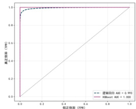 在测试集上,逻辑回归存在较多漏判( FN=4029 )与误杀( ⋅FP=1855, ),表现出明显盲区。而XGBoost在0 误判欺诈样本的同时,误报仅为 34 笔,展现出更强的拟合能力。3.2ROC 曲线与 AUC 值比较