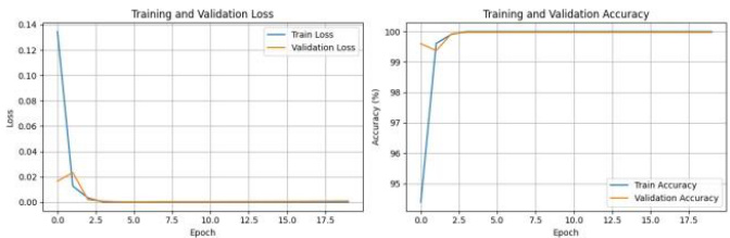 右图的准确率曲线中,训练准确率(Train Accuracy)与验证准确率(Validation Accuracy)均呈现快速上升后趋于稳定的态势。训练初始,训练准确率从接近 0 迅速攀升至约 99.5% ,验证准确率也同步达到相近水平。在后续训练轮次(Epoch>2)中,二者持续小幅上升并最终稳定在 100% 左右(训练准确率)和接近 100% (验证准确率)。这说明模型在极短的训练周期内,就已掌握数据的核心分类规律,对傲慢语言和非傲慢语言的判别能力达到较高水准。