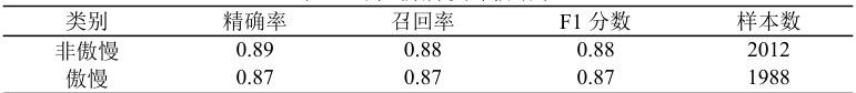 如下表 4-1 显示,模型在独立测试集上取得了 88.3% 的准确率,其中对傲慢样本的精确率为 0.87,召回率为 0.87,F1 分数 0.87;非傲慢样本的精确率与召回率分别为0.89 和 0.88,F1 分数 0.88 。各项指标均衡,表明模型对正负样本均具有较强的识别能力。特别地,傲慢样本的召回率达 87% ,说明模型在处理少数类时未出现显著的漏检问题,这得益于数据增强技术对样本分布的均衡化处理。