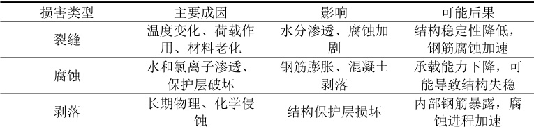 以下表格详细列出了道路桥梁混凝土结构常见的损害类型及其主要成因: