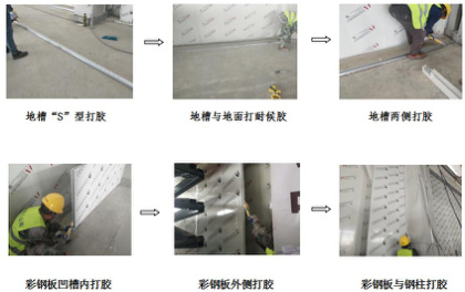 ①在彩钢板、双层龙骨的凹槽中提前按S 型打入适量密封胶