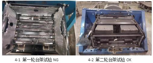 第一轮台架试验出现蓄电池侧滑限位块变形、压条变形问题,如图8-1,最终实验失败。第二轮试验通过更改蓄电池限位、降低蓄电池压条安装高度、增加压条拉杆、将Z字形限位与蓄电池压条压紧固定相结合以解决上述压不紧问题,最终通过8小时(10g加速度)+4小时台架试验及2000公里整车可靠性试验,如图8-2所示。