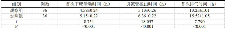 (2)术后恢复:观察记录患者术后首次下床活动时间、引流管拔出时间与首次排气时间。