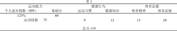 体育核心素养是核心素养在体育学科的具体化,主要包括运动能力、健康行为、体育品德三个维度。可以划分为体育精神、体育品格、运动技能、运动习惯、健康知识五个方面。其中体育精神、体育品格、运动习惯、健康知识四个方面的进步很难用客观数据进行测量,因此针对以上4 个指标,本研究采用教师赋分的形式分别进行评价,每个指标基本分(初始印象)为10 分,赋分范围为0-15 分,教师可根据这段时间学生的体育锻炼频率、热身与拉伸认真程度、保护手法掌握情况、体育竞赛的积极性与精神状态、互帮互助、不怕困难勇于挑战、是否遵守比赛规则等方面的实际表现进行评价。