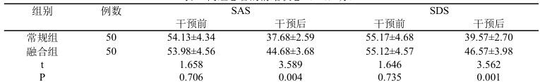 干预后,融合组患者的 SAS、SDS 评分均低于常规组,差异有意义,P<0.05,见表1。