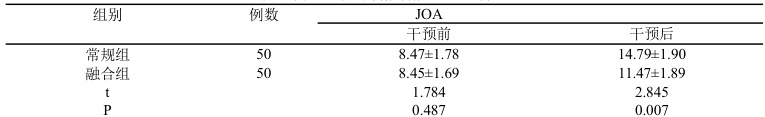 融合组患者的颈椎功能评分高于常规组,差异有意义,P<0.05,见表2。