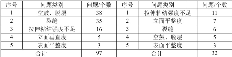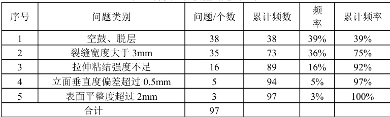 对策实施后,对现场 13 轴至17 轴抹灰施工质量进行了同步抽检,并与上次检查数据进行对比分析。空鼓、脱层及裂缝问题的数量由 74 个减低到 11 个,问题总数由 97个降低为 32 个,空鼓、脱层及裂缝不再是影响抹灰质量合格率得症结。提高抹灰质量一次验收合格率由原来的 84.5% 提高为 94.7% ,达到了预期目标。