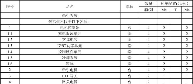 牵引系统配置如下表所示: