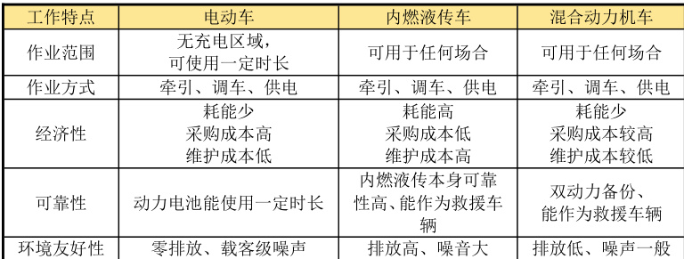 伴随着油改电这一技改热点的兴起,当前除了传统的内燃机车,主要还有纯电传动以及油电混合(柴发与动力电池双动力)两种机车车型,从作业范围、作业方式、经济性、可靠性、环境友好性等5 个方面对这3 种车型进行对比,具体如表1 所示。