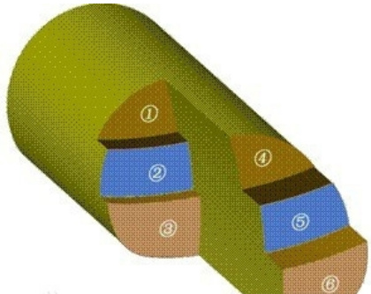 CD 工法(如图 1 所示)会把隧道断面划分成左右两个部分,首先对一侧进行开挖,然后施作初期支护以及中隔壁,之后再开挖另一侧,这种工法相较于 CRD 工法而言,施工工序相对没那么复杂,可加快施工的进度,在围岩稳定性稍微好一些,隧道跨度处于适中状态的水利工程中应用较为广泛。在施工进程中,密切留意中隔壁的受力状况,防止它出现变形、破坏的情况,影响施工安全,和 CRD 工法相比,CD 工法对围岩的扰动相对大一点,在实际应用的时候需要依据具体地质条件合理选择。