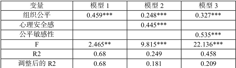 本文借鉴温忠麟等学者的做法,采用层级回归法,将组织公平中的分配公平、互动公平和程序公平作为因变量对心理安全感和公平敏感性两个变量进行中介效应检验,结果如表所示。为简化设计,表格中未显示控制变量。其中,模型 1 是组织公平对员工创新绩效的回归模型;模型 2 是组织公平、心理安全感对员工创新绩效的回归模型;模型 3 是组织公平、心理安全感和公平敏感性对员工创新绩效的回归模型。