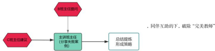 班主任的成长应该是在群体中获得,在同伴互助下,更能清晰地了解自己地优劣势,进而扬长避短,课题组采用“1+1+1”模型(1 人讲述→1 人提问→1 人建议),使 80%参与教师在 6 个月内减少“威权式管理”行为 11。课题组在组织班主任“脆弱性叙事”环节中,操作模式为: