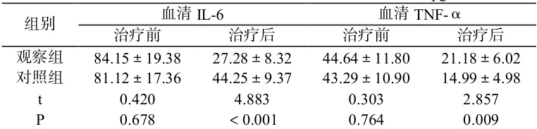 治疗后观察组血清 IL-6( 27.28±8.32 )低于对照组;观察组血清 TNF-∝ ( 21.18±6.02 )高于对照组( P<0.05 )。