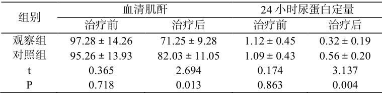 治疗后,观察组血清肌酐( 71.25±9.28 )、24 小时尿蛋白定量(0.32±0.19 )均低于对照组( P<0.05 )。详见表 1。