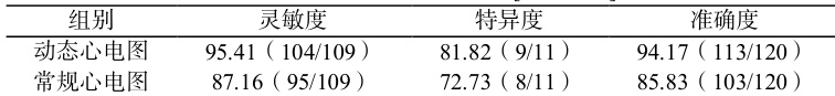 动态心电图的灵敏度特异度准确度分别为 95.41% 、 81.82% 、 94.17% ,均高于常规心电图的 87.16% 、 72.73% 、 85.83% ,见表 2。