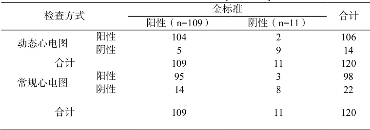 120 例疑似冠心病心律失常患者中,经金标准诊断为 109 例冠心病心律失常患者;经动态心电图检出 106 例高于常规心电图 98 例,见表 1。