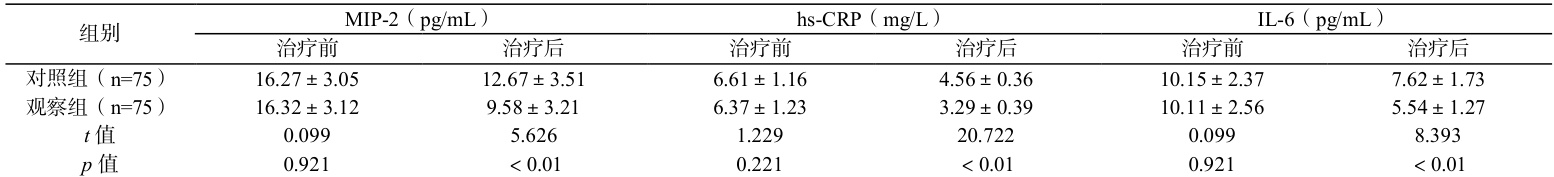 1.3.1 评估两组治疗前后炎症因子,包括巨噬细胞炎症蛋白-2(MIP-2)、超敏 C 反应蛋白(hs-CRP)、白细胞介素-6(IL-6)。