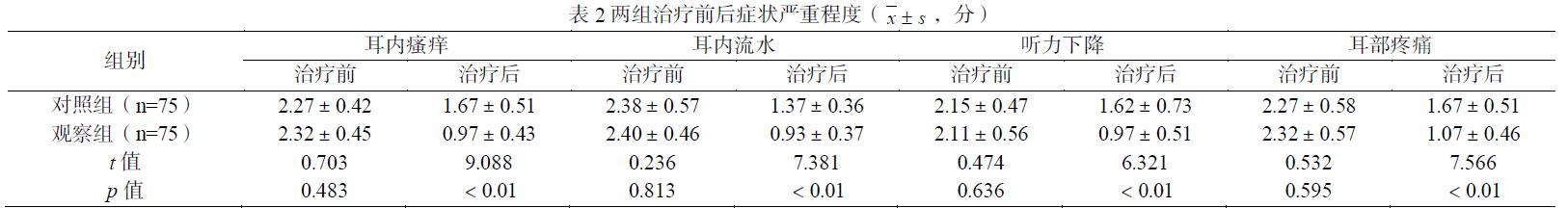 1.3.2 评估两组治疗前后症状严重程度,主要包括耳内瘙痒、耳内流水、听力下降、耳部疼痛症状,分值在 0-3 分,0 分表示无症状,3 分表示重度。
