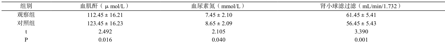 观察组血肌酐、血尿素氮低于对照组,观察组肾小球滤过率高于对照组(P<0.05 )。