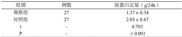 (2)两组患者蛋白尿指标比较:收集患者 24 小时尿液,采用免疫比浊法测定尿蛋白定量。